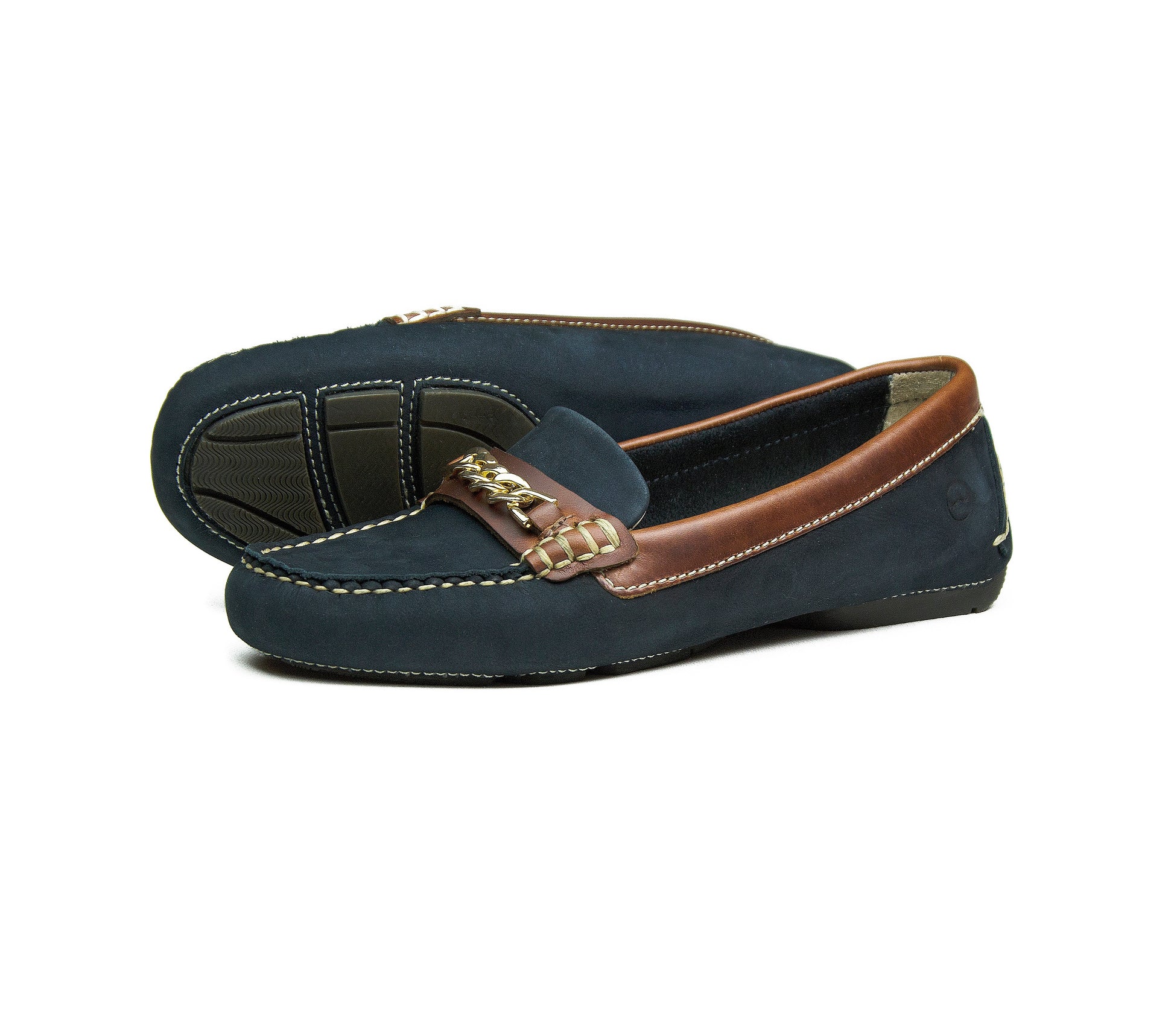 This loafer has a classic chain fronted, this is a lightweight shoe but very tough, it has been hand stitched together, with a full leather footbed. This loafer has a rubber sole which is lightweight and you are guaranteed for this loafer to leave no trace nor cause slips. The sand colour is made with oiled nubuck leathers, whilst the Navy-oak is made with pull up leathers for added softness and comfort.