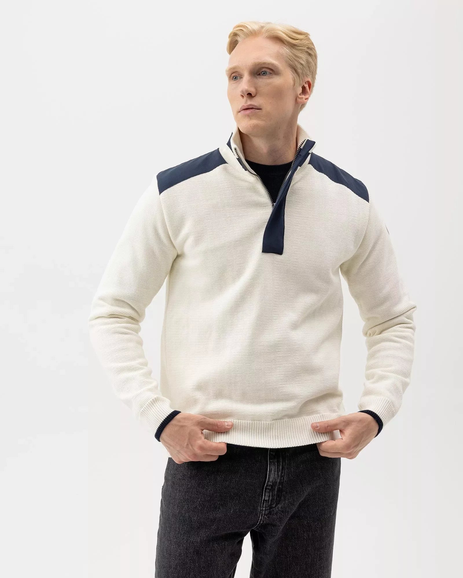 Wind-lined knitted sweater 100% organic cotton. Structured knit with woven details on the collar. Short zipper and normal to generous fit.